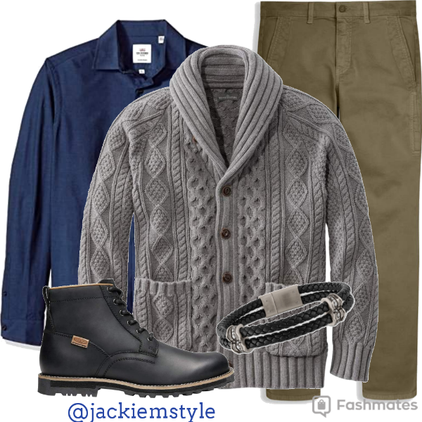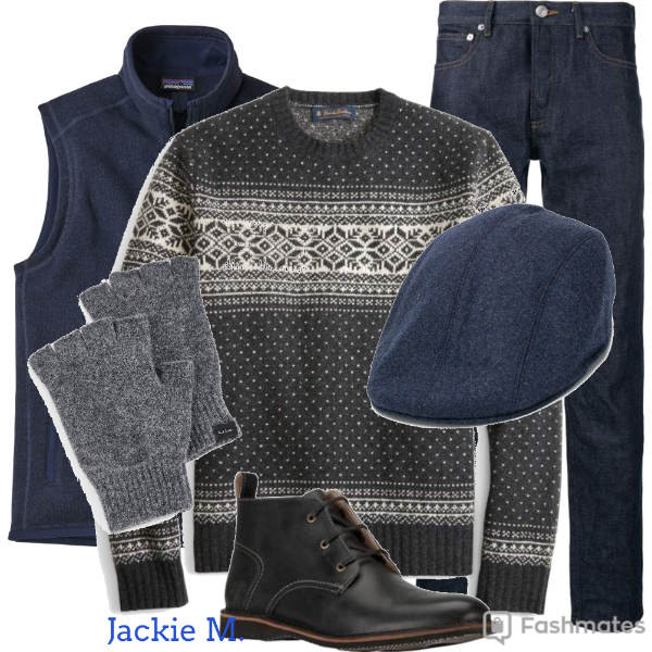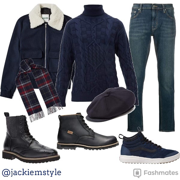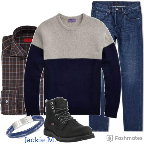 - Ajoutez un chandail à col rond ou en V qu’on met par-dessus la chemise ou le col roulé.