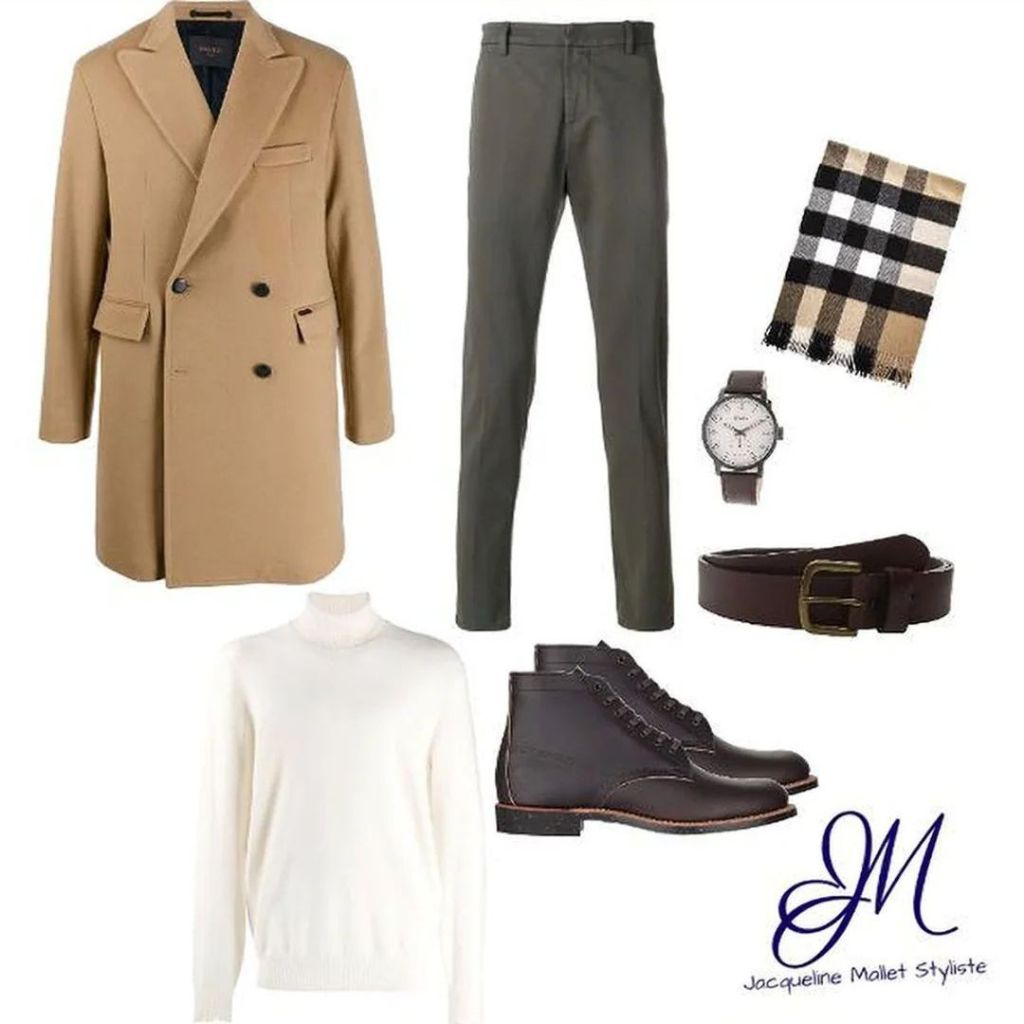 On délaisse les mocassins estivaux pour des bottines élégantes ou des derbies en cuir. Un foulard discret ou une montre à bracelet cuir foncé complètent parfaitement la tenue.